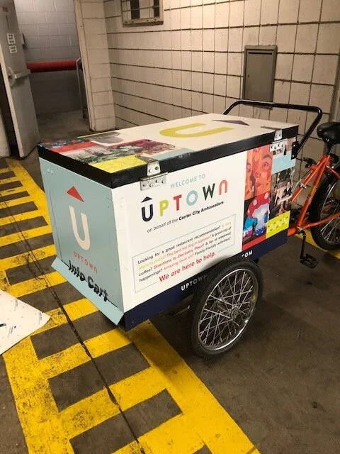 A custom-wrapped info cart Uptown is manned during the day by Center City Ambassadors to welcome visitors, answer questions about the area, and also be a resource for those in need of assistance Uptown.